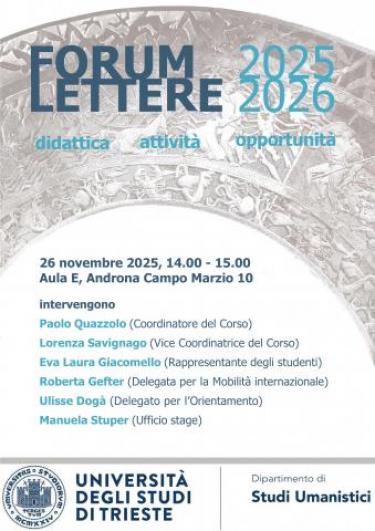 L’evento Forum Lettere 2025-2026 propone uno spazio di informazione e discussione sulla didattica, le attività, le opportunità offerte dal Corso di Laurea Triennale in Lettere.