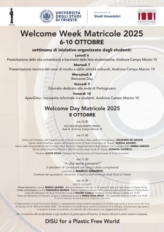 La terza giornata ha visto la proposta dell'annuale Welcome Day Matricole 2025, giornata di accoglienza delle nuove matricole moderata da Ulisse Dogà, Delegato all'Orientamento del DiSU, con i saluti istituzionali del Prorettore dell'Università degli Studi di Trieste, Mauro Tretiach, del Direttore del DiSU, Massimo Degrassi, in collegamento da remoto presso la sede di Portogruaro Campus, della Direttrice vicaria del DiSU, Sergia Adamo e della Vicepresidente del Consiglio degli studenti e Rappresentante degli studenti nel Consiglio DiSU, Emma Cerato.